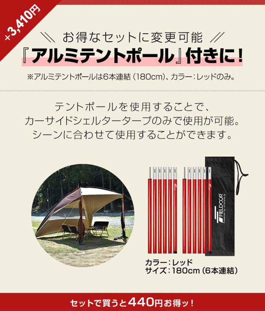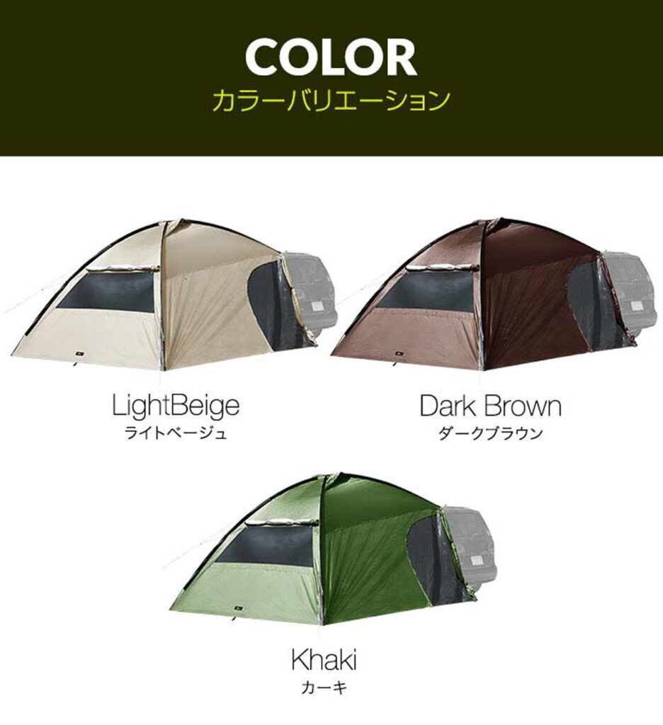 カラーは ライトベージュ/ダークブラウン/カーキ の3色展開。どのカラーも落ち着いたトーンで、車との一体感を損なわず、自然の風景にも溶け込みます。無骨すぎず、ファミリーからソロキャンプまで使える上品なデザイン。FIELDOORらしい“シンプルで実用的”な美しさです。