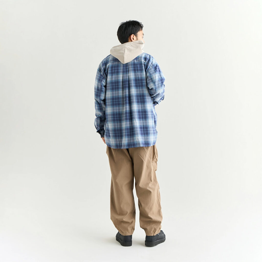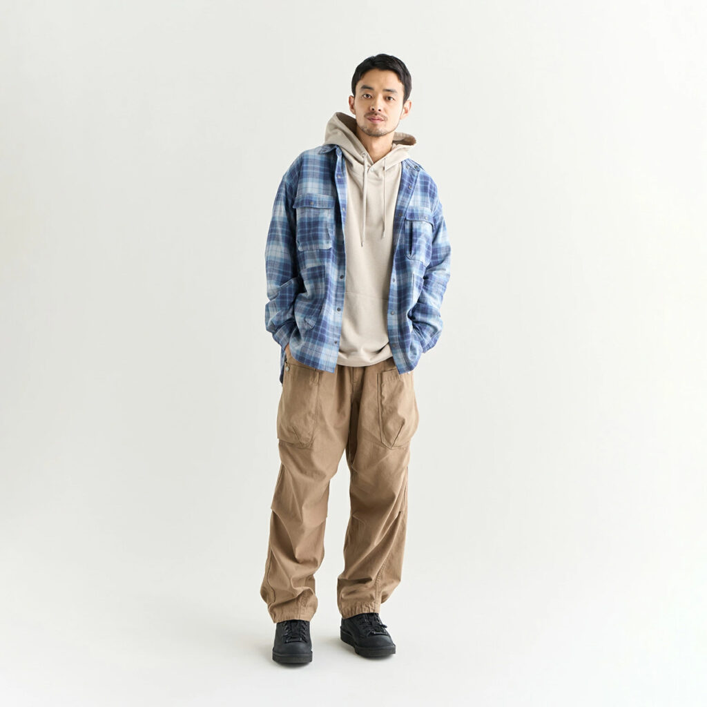 このモデルの特徴は、「シャツとカバーオールの中間」という絶妙なバランス。軽い羽織りとしても、アウターの下の中間着としても使える万能デザインです。インナーにスウェットやパーカーを合わせても、肩まわりに余裕のある設計。ボリューム感のある重ね着にも対応し、朝晩の寒暖差が激しいキャンプシーンに最適です。