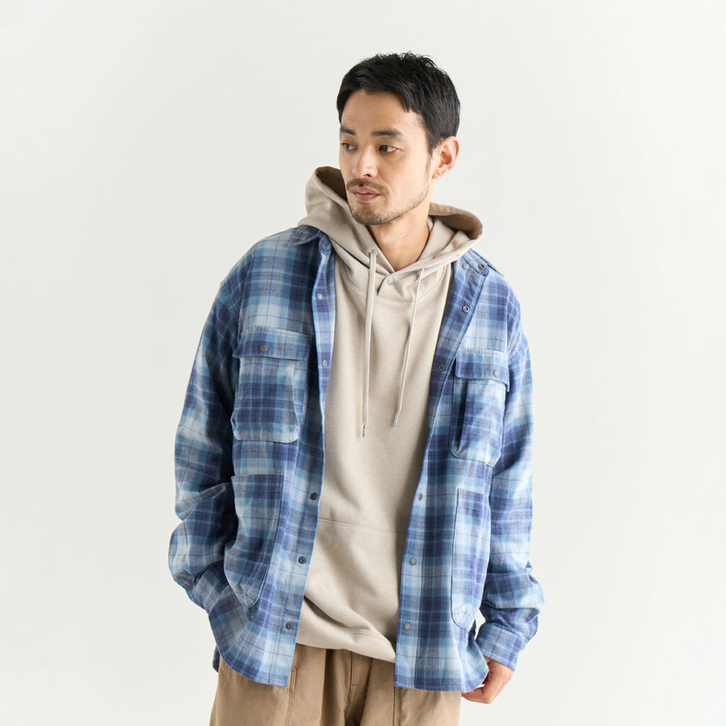 実際に着てみると、想像以上に軽くて暖かい。キャンプの朝晩、気温10℃前後でもロンT+このシャツでちょうど良い。特に気に入ったのは、背中と腕の動かしやすさ。二枚袖構造の効果で、薪をくべる時やコーヒーを淹れる時もツッパリ感ゼロ。ヴィンテージ調のオンブレ柄は、アウトドアだけでなく街着としても違和感がなく、デニムやチノパンとの相性も抜群です。個人的には、GRAY×BLUEが一番バランス良くておすすめ。どんなアウターの下にも馴染む万能カラーで、冬の差し色としても優秀です。