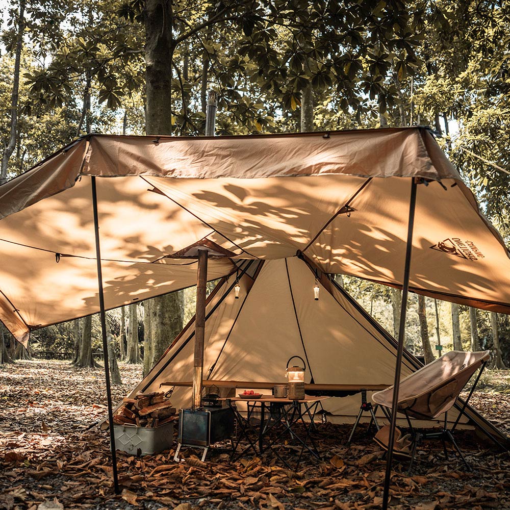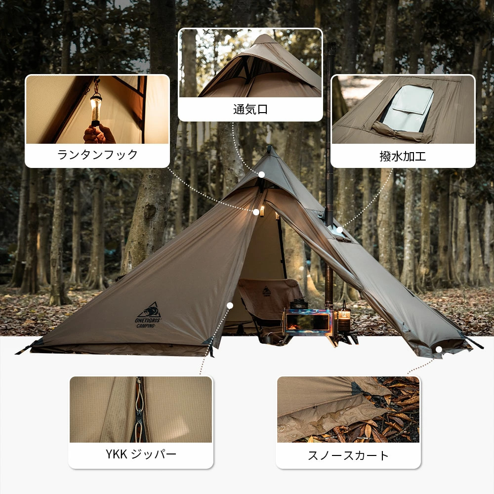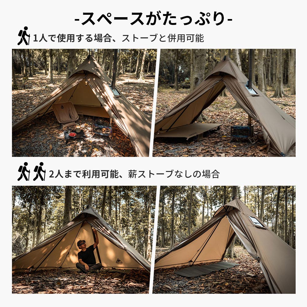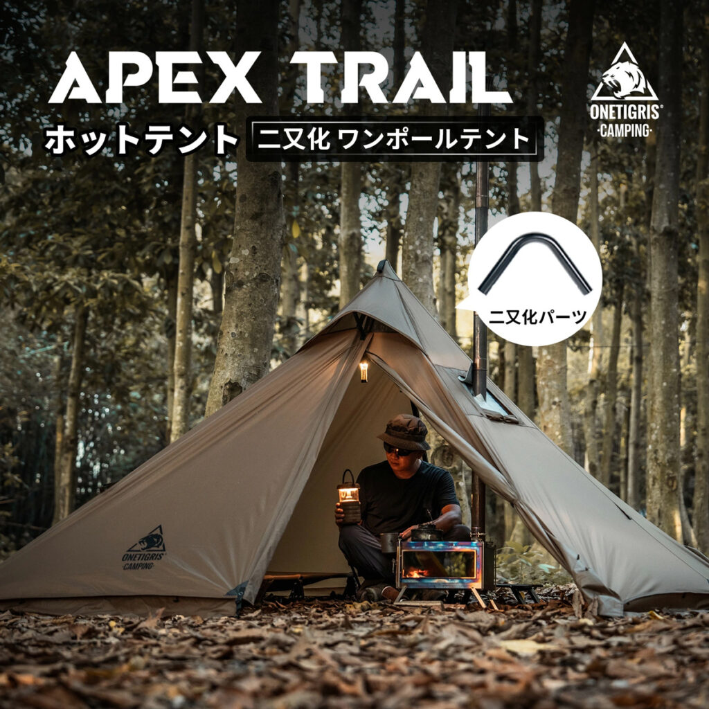 OneTigris APEX TRAILは、二又フレームの広い居住空間と薪ストーブ対応の機能性を兼ね備えた、まさに次世代ソロテントの完成形。焚き火のぬくもりを感じながら、風や冷気を遮断し、快適に眠る──。耐水・防風・通気・安全性すべてを一台に凝縮した万能モデルです。キャンプ初心者から上級者まで、「一張りでオールシーズン完結したい」人にこそおすすめのテントです。