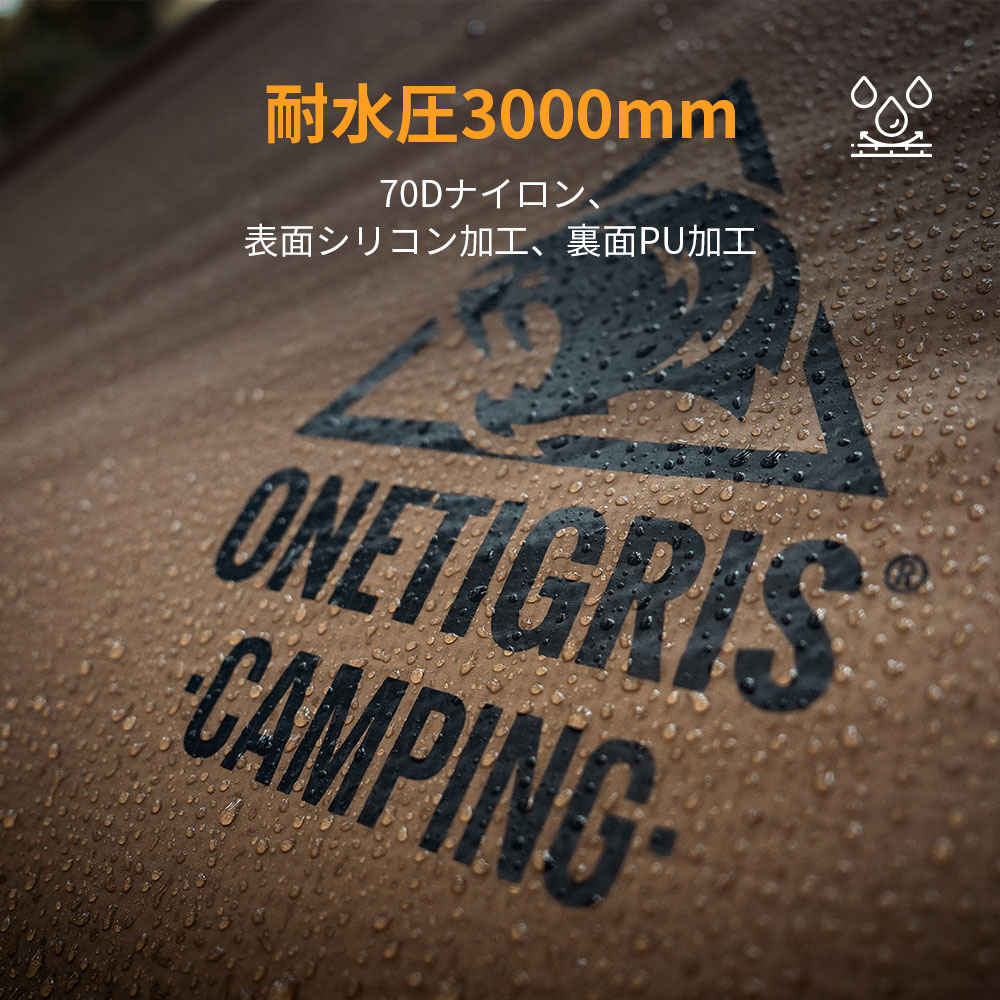 表面には70Dリップストップナイロン(片面シリコン加工)、裏面にはPUコーティングを採用。裂け防止構造+撥水性+軽量性を兼ね備え、重量は約3.6kg(ポール抜き2.51kg)。耐水圧3000mmで、長時間の雨でも浸水の心配なし。防風・防雪にも強く、登山やバイクキャンプにも適しています。