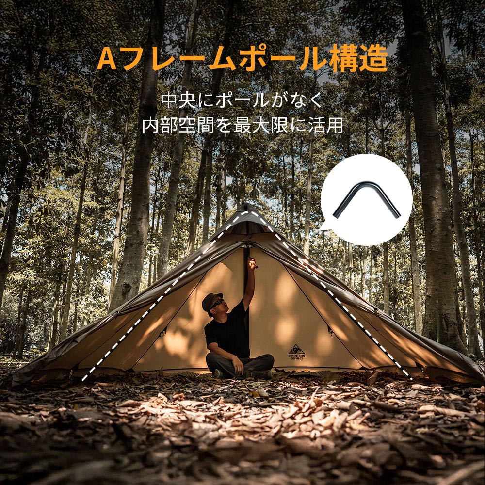 従来のワンポールテントは中央ポールが邪魔になりがちでしたが、APEX TRAILは二又フレーム構造(Aフレーム)を採用。これにより中央スペースがスッキリと空き、コットやテーブルを自由にレイアウト可能。テントサイズは約L280×W280×H155cmと、ソロ〜デュオでも快適な広さを確保しています。安定性も高く、強風下でも倒れにくい構造。過酷な環境下でのテストをクリアしており、四季を通して頼れる一張りです。