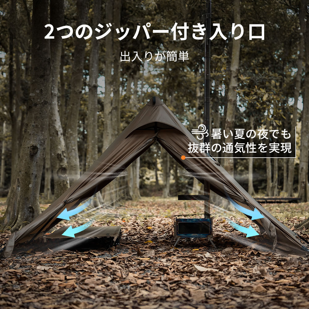 テント下部にはフルスノースカートを装備。冷気・雨・虫の侵入を防ぎつつ、巻き上げて通気を確保できるため春夏も快適。上部には2つのメッシュ通気口を配置し、テント内の熱や湿気を効率的に排出。結露を軽減し、ストーブ使用時でも空気循環を維持します。まさにオールシーズン対応の“通気型ホットテント”です。