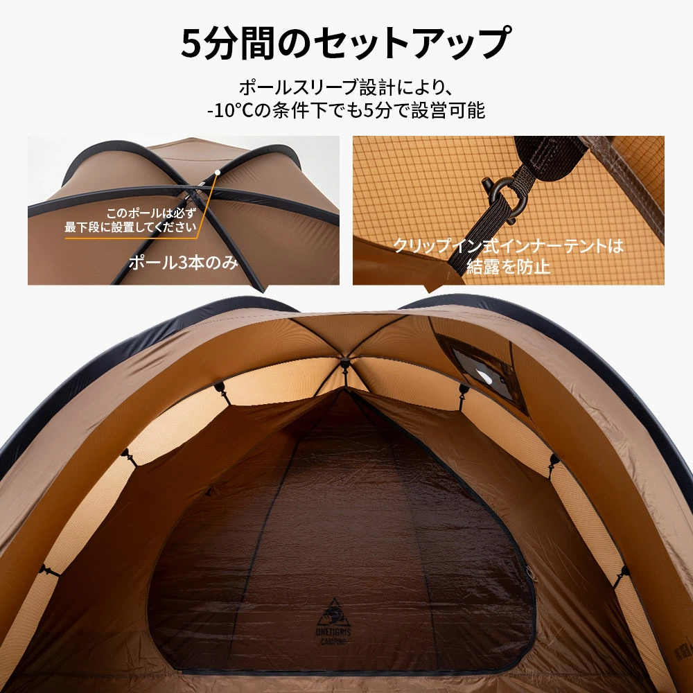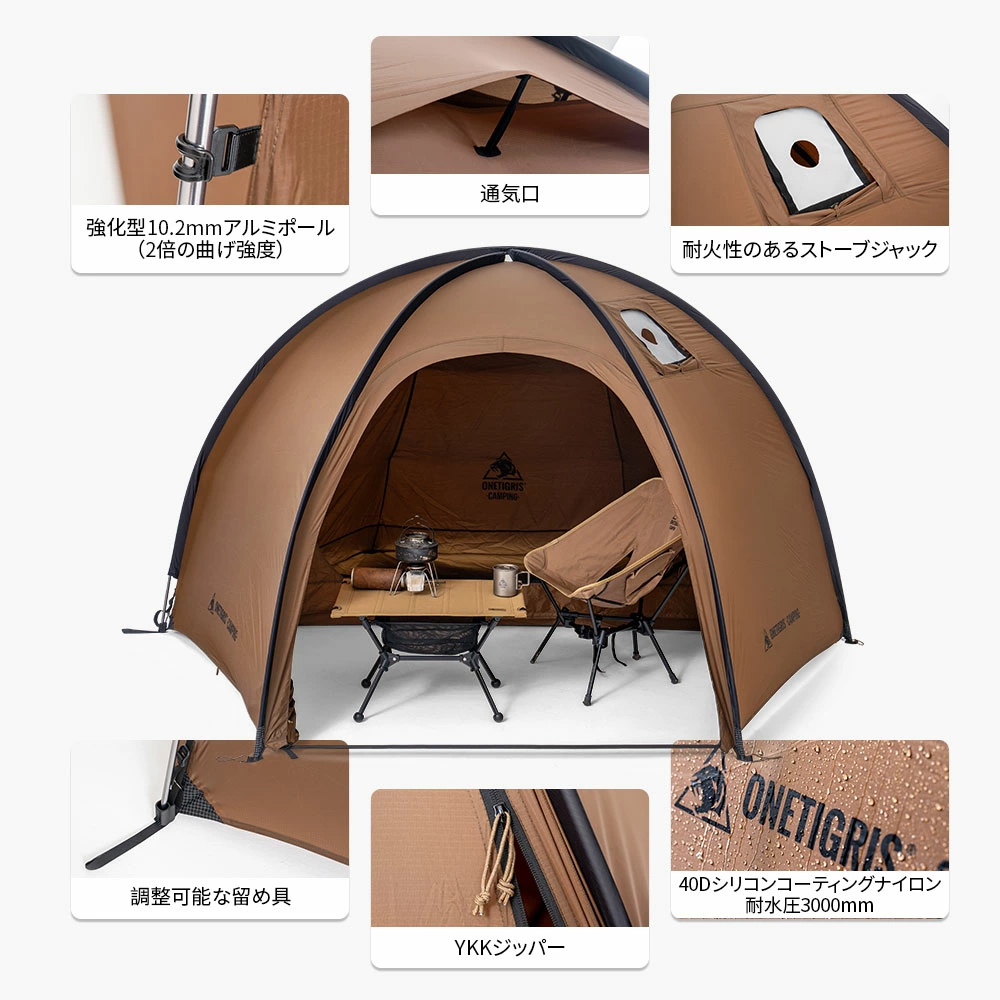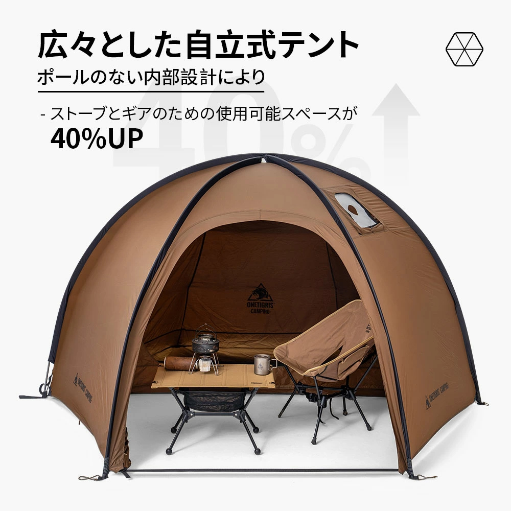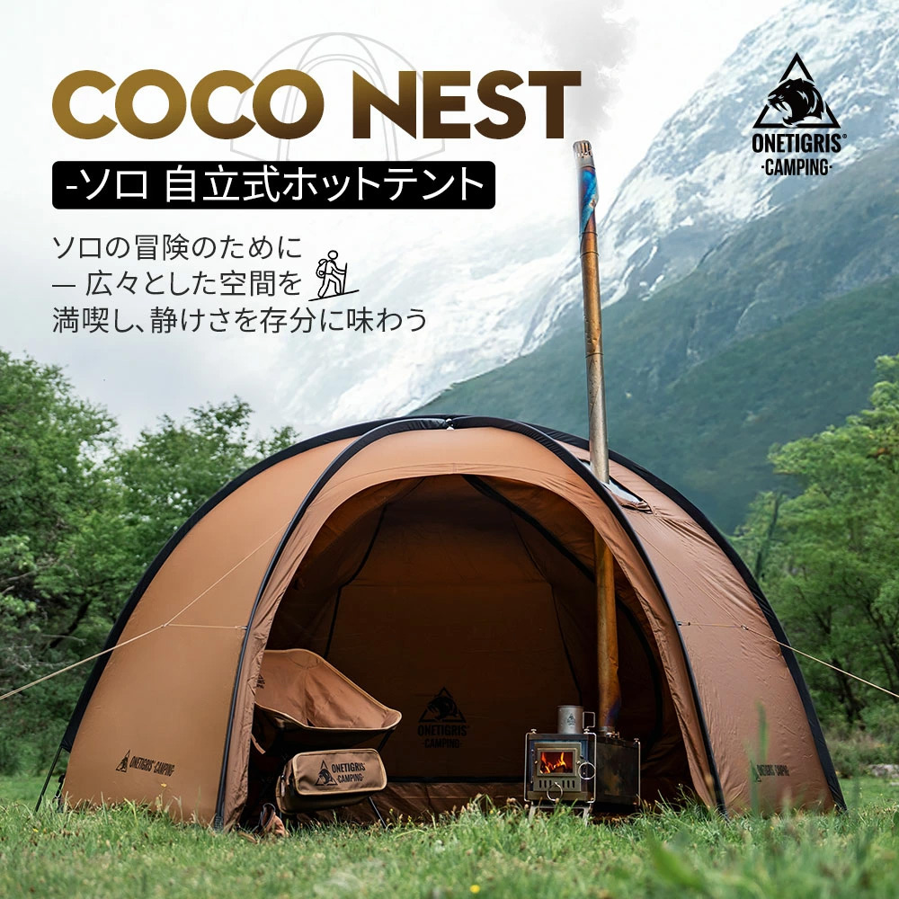 ソロキャンプで“快適さと設営スピード”を両立したい人におすすめしたいのが、OneTigris COCO NEST(ココネスト)。六角形の自立式構造と薪ストーブ対応の煙突穴を備えた、万能ドームテントです。設営はわずか5分。軽量・高耐久・高防水。そして見た目の美しさまで兼ね備えた、ソロキャンパーの理想が詰まっています。