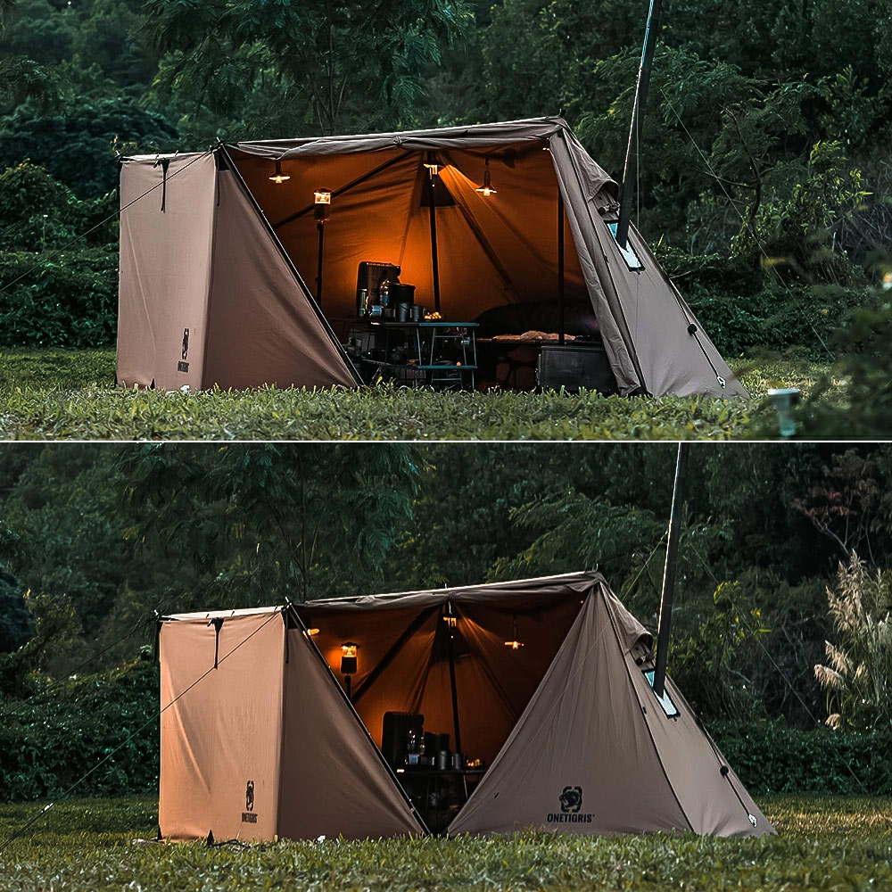 「冬に焚き火をしても風が冷たい」「人が多くて落ち着けない」──そんなキャンプの悩みを解決してくれるのが、OneTigris ポリコットンT/C 前幕です。同ブランドのROC SHIELD TCテントと組み合わせることで、風除け・目隠し・居住拡張を一気に叶える万能アイテム。前室を延長して“自分だけの秘密基地”のような快適空間を作ることができます。