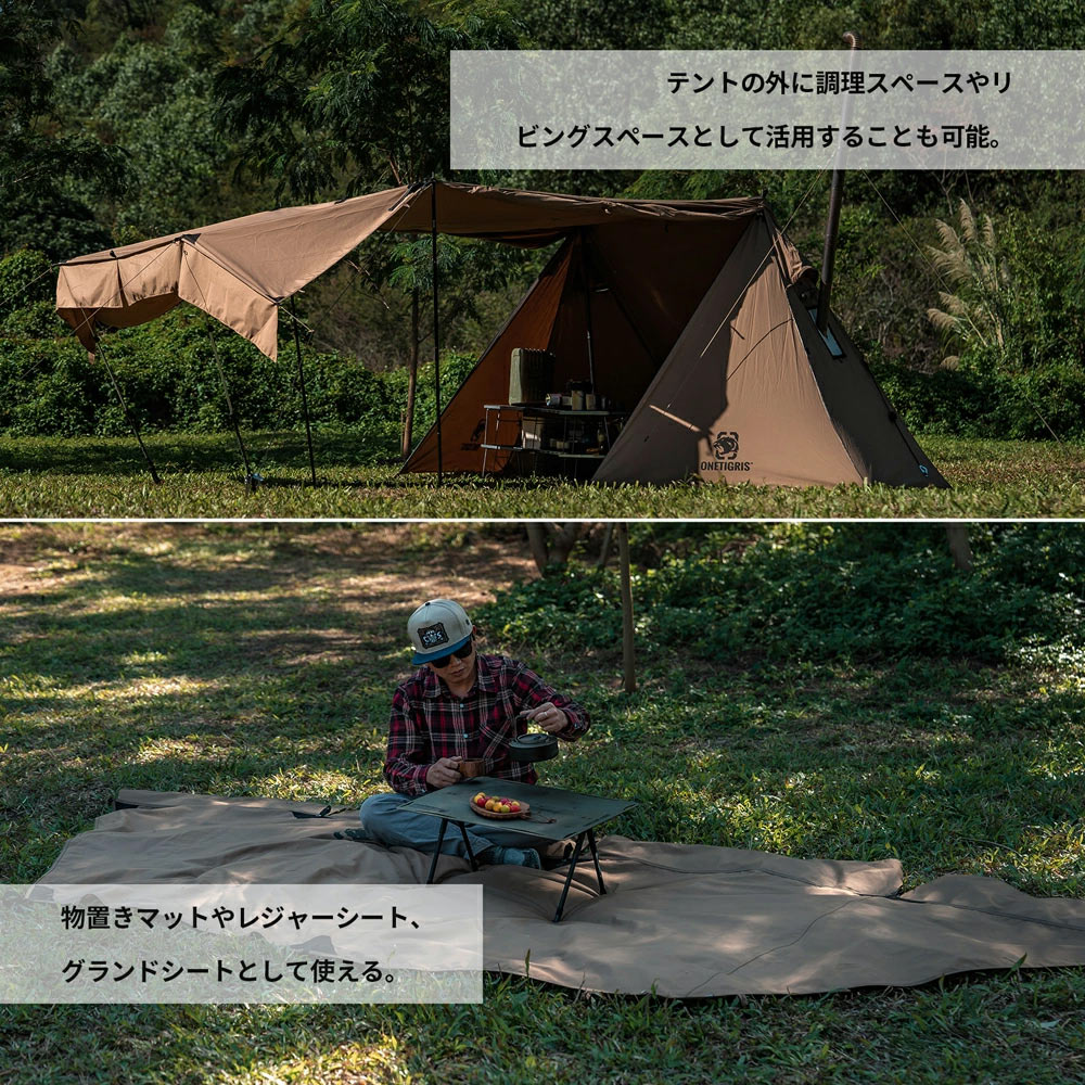 素材にはポリコットンT/C生地(ポリエステル+コットン混紡)を採用。この生地は難燃性・耐摩耗性・遮光性に優れており、焚き火シーンでも安心。またコットン特有の温もりと通気性があり、結露を軽減して快適な室内環境を保ちます。カラーは自然に溶け込むブラウンとアーミーグリーンの2色。OneTigrisのテントと同系色で統一すれば、サイト全体に統一感が生まれ、ミリタリーライクで無骨なスタイルを演出できます。