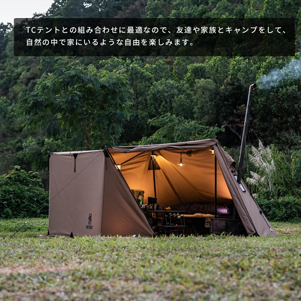 耐熱性に優れたポリコットンT/Cは、焚き火や薪ストーブとの相性も抜群。冷たい風を遮りながら、圧迫感のない半屋外リビングスペースを作り出せます。ストーブを囲んで食事や会話を楽しむ──そんな“冬キャンプの理想形”がこの幕一つで実現します。