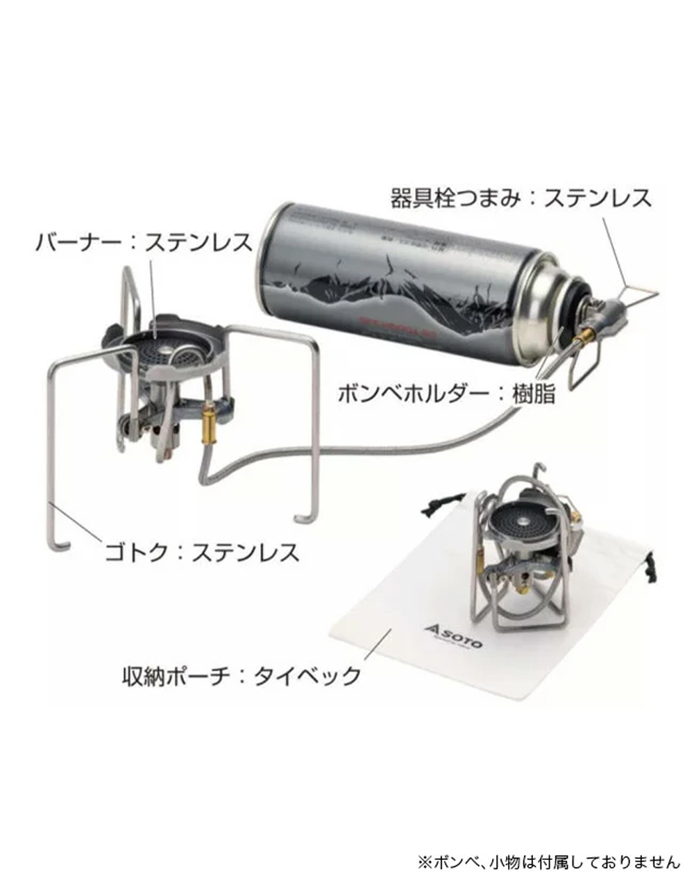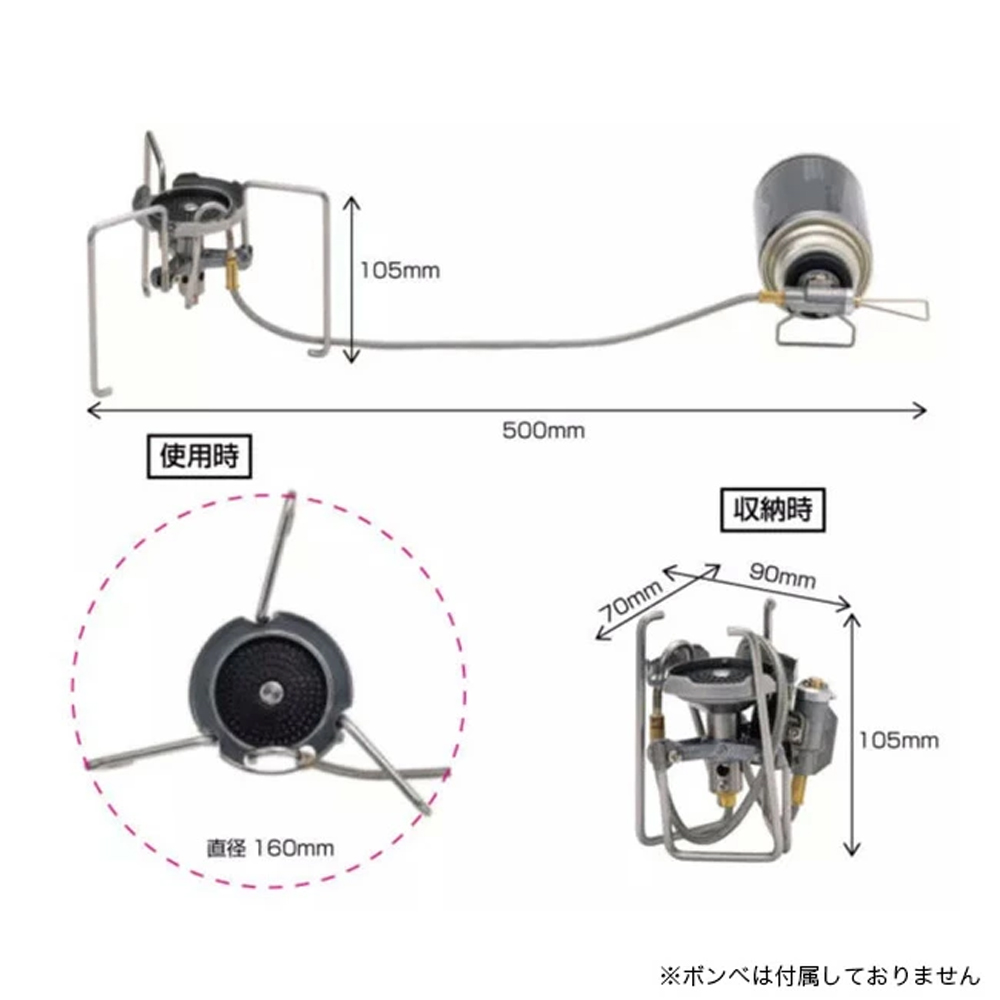 - 材質:バーナー・器具栓つまみ・ゴトク:ステンレス/ボンベホルダー:樹脂/収納ポーチ:タイベック