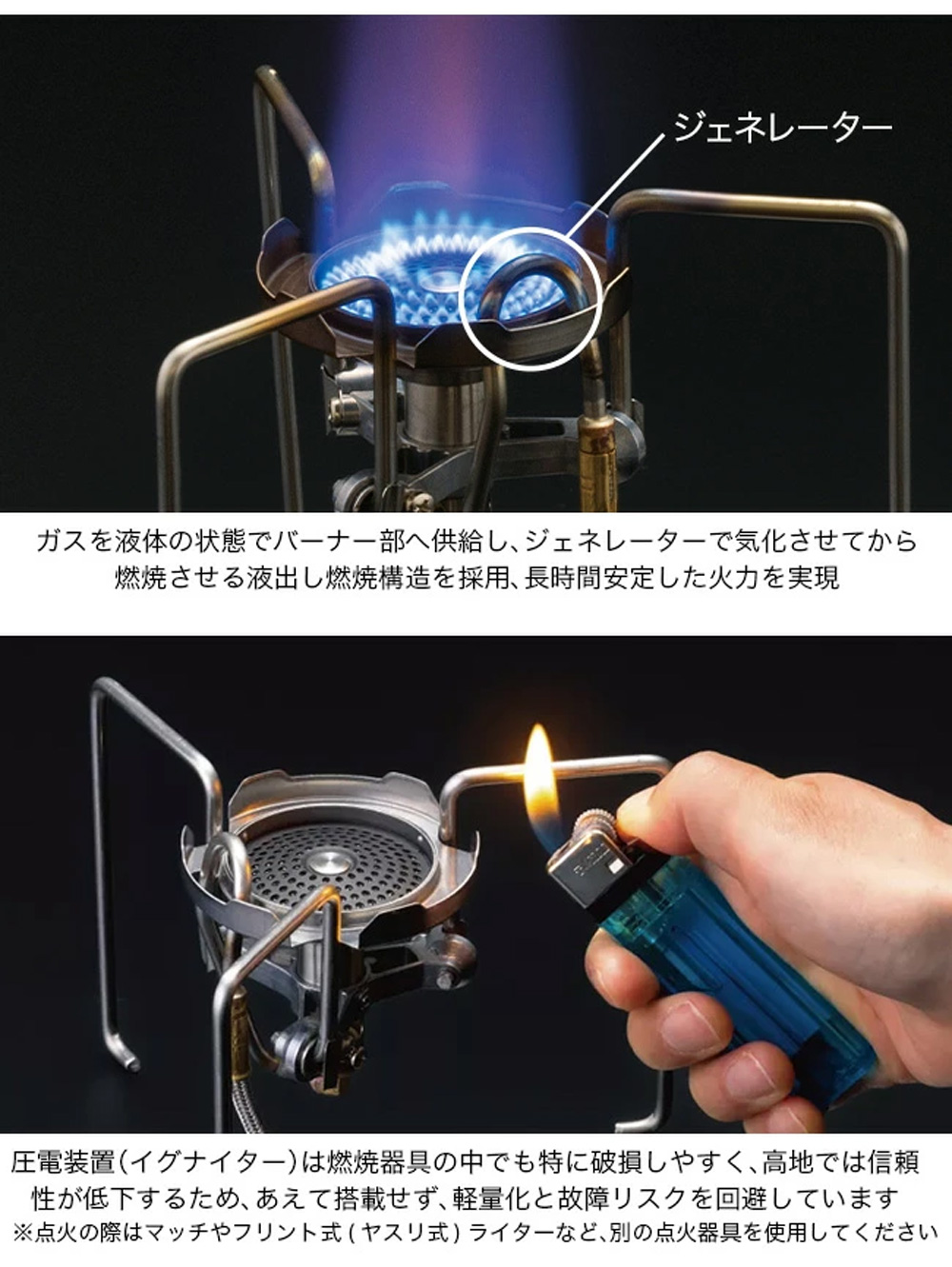 - 点火方式:マッチやフリント式ライターなどで手動点火(圧電装置なし)