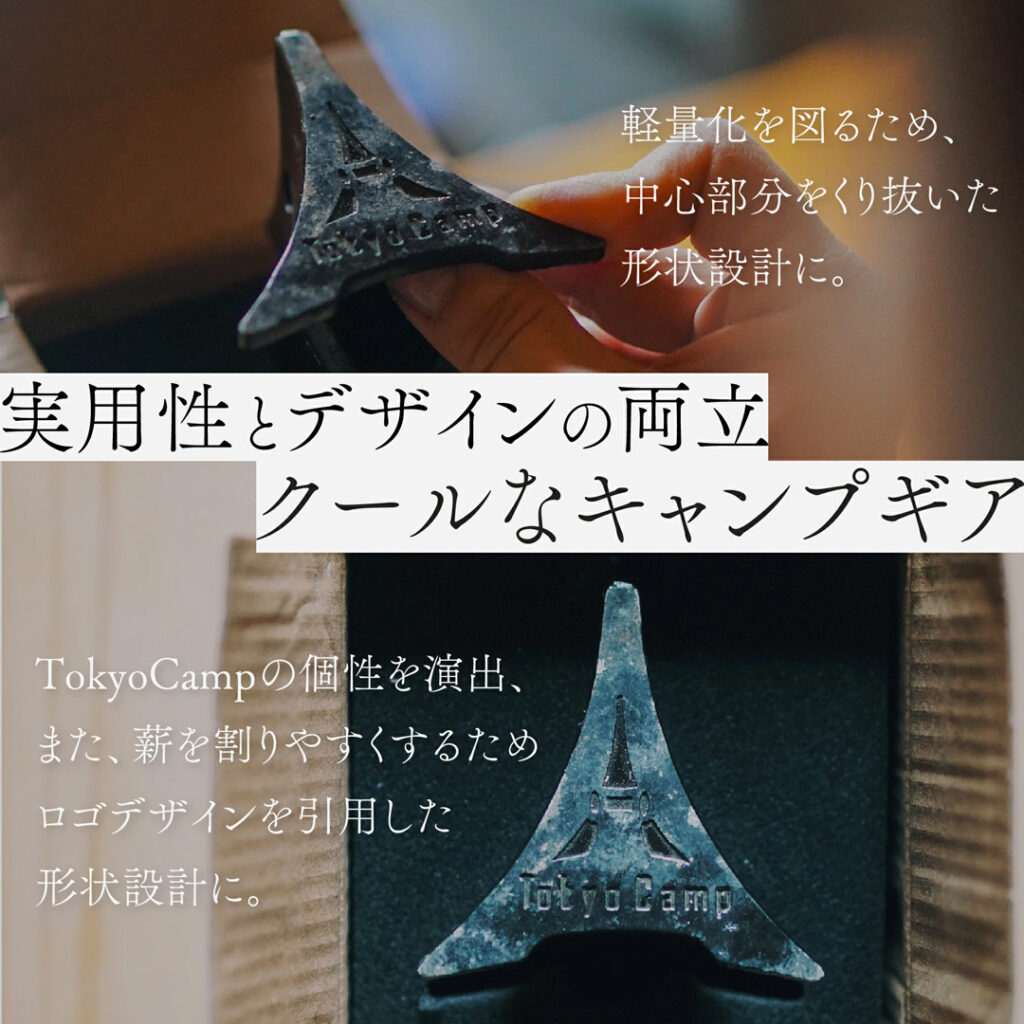 TokyoCampが開発した「クサビタワー」は、“実用性とデザイン性の両立”をコンセプトに誕生したアイテム。接ぎ目のない一体型の鋳造成形で作られており、割れや歪みの心配がなく、長く使える堅牢な仕上がり。中央部をくり抜いた独自デザインは、見た目の軽快さだけでなく、重量バランスと打撃効率の最適化にも貢献しています。ブラックの塗装で仕上げられた本体は、無骨すぎず上品な印象を持ち、キャンプサイトのギア群の中でも存在感を放ちます。
