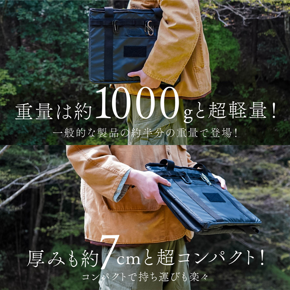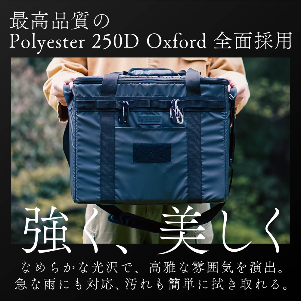 という三拍子揃ったアウトドア特化素材。内部の補強板には耐衝撃性に優れたポリカーボネートを使用しており、満載状態でも型崩れせず、車載中の荷崩れも防ぎます。「軽いのにしっかりしている」「見た目も高級感がある」とのレビューが多いのも納得です。