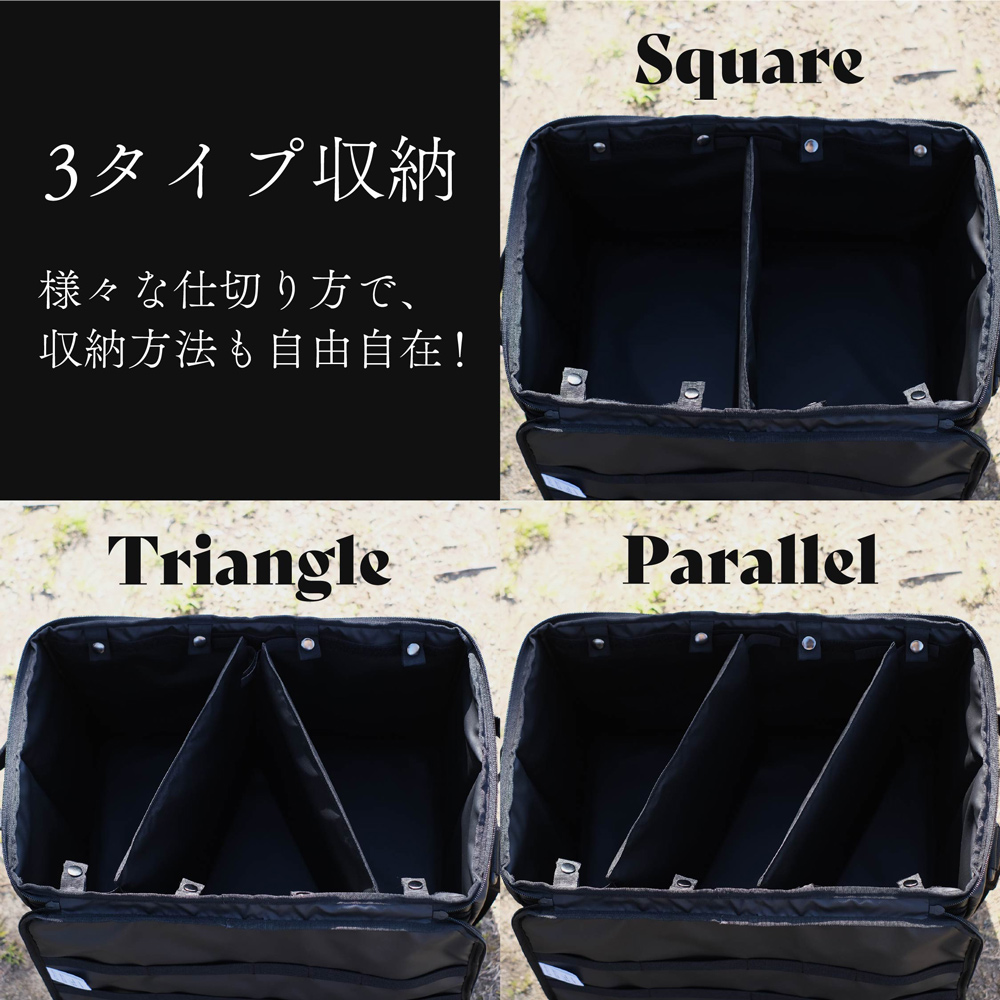 キャンプでは、調理器具・ランタン・焚き火ツール・食器…と、どうしても荷物が多くなります。このソフトコンテナは、37Lの大容量ながら内部が3つに仕切れる設計で、「小物が散らからない収納」が実現できるのが大きな特徴。