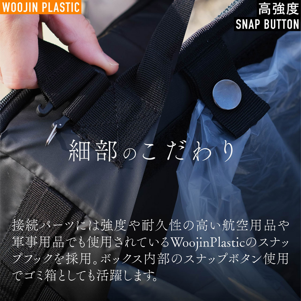 内側のスナップボタンに袋を固定すれば、袋がズレずにぴったり収まる“即席ゴミ箱”に変身。キャンプサイトを汚さず、整理された空間をキープできます。