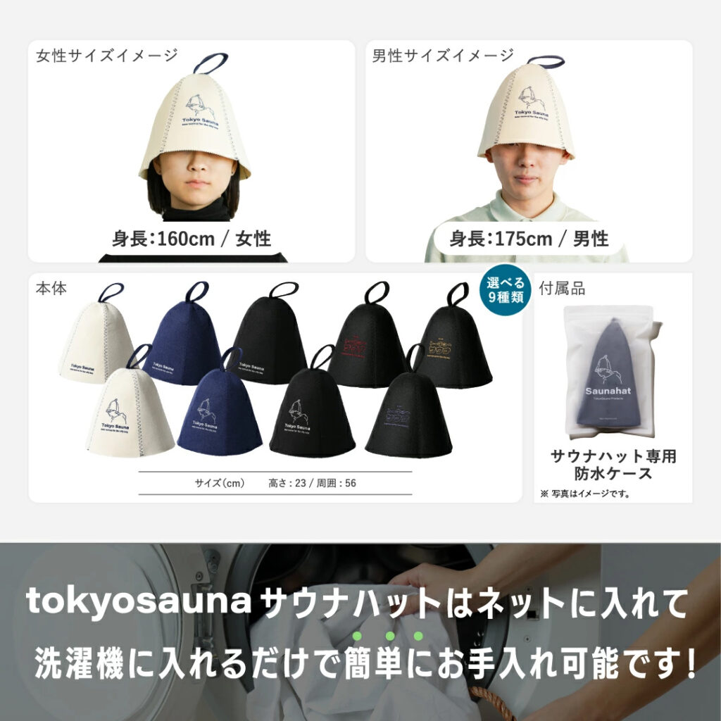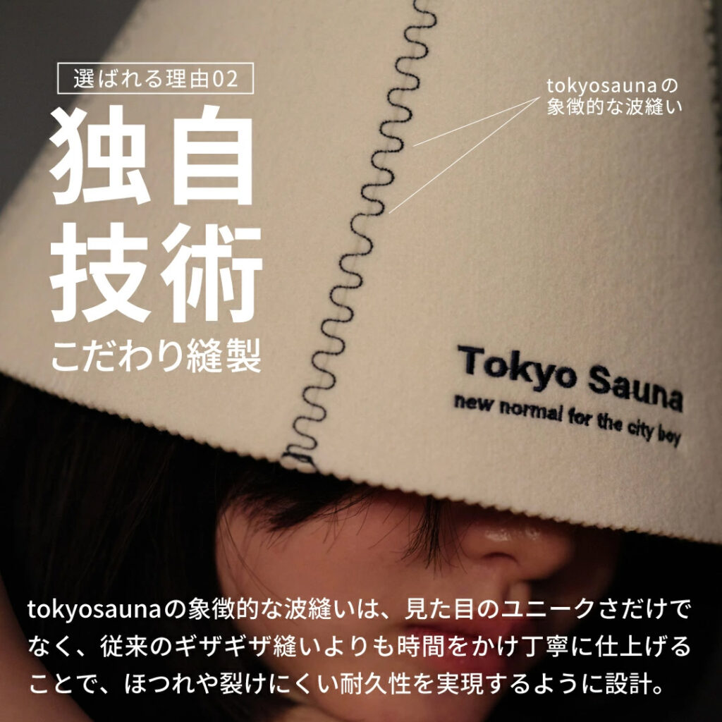 生地には、tokyosauna独自の高耐久素材を使用。旧モデルでは羊毛素材が採用されていましたが、現在は順次ポリエステル100%素材へリニューアル中。これにより、軽量化と速乾性が大幅にアップ。屋外のテントサウナなど、湿度の高い環境でも扱いやすくなりました。また、品質評価機構の試験にも合格しており、洗濯耐性・形状保持性・縫製強度すべてにおいて高水準。「長く使えるサウナハット」として信頼性も抜群です。