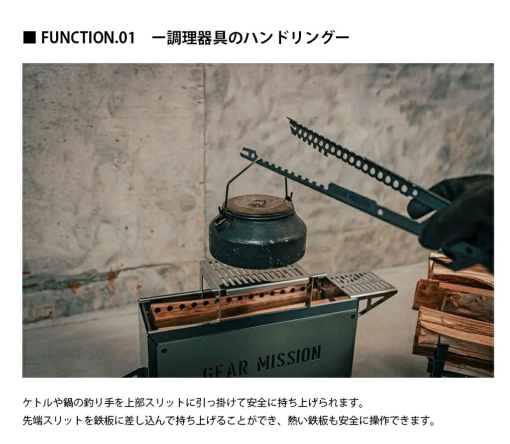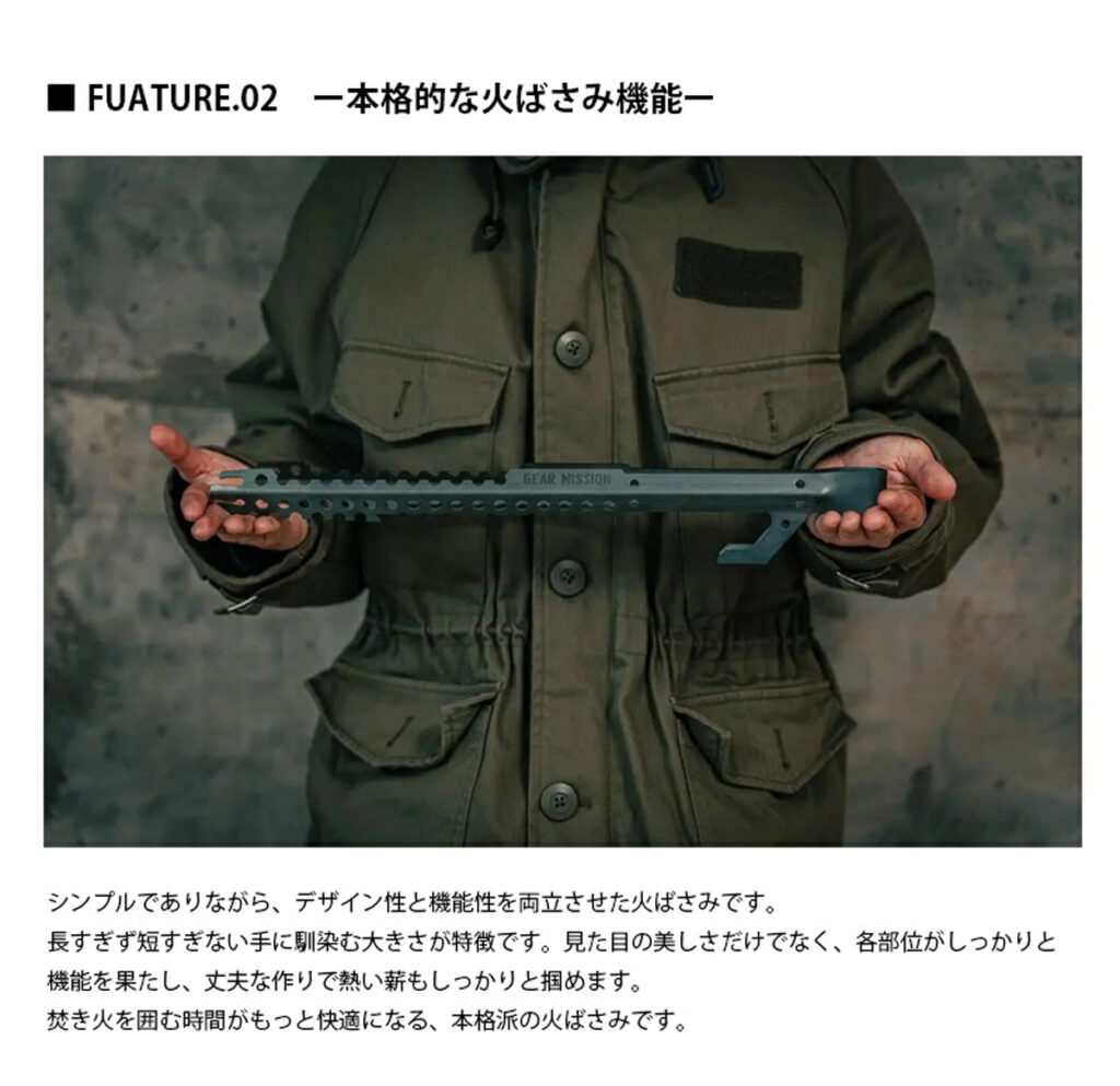 VG-GM1はトヨトミの「GEAR MISSION」シリーズのひとつ。灯油ストーブやヒーターで知られるトヨトミが、キャンプギアとして立ち上げたブランドラインです。どの製品も“道具としての完成度”を徹底追求しており、この火ばさみも例外ではありません。熟練の職人による加工で、鉄の厚みやバランスが緻密に設計されています。開閉のしなやかさ、掴みの力加減、剛性感──どれをとっても国産クオリティです。